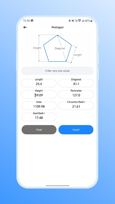 Die App berechnet Kantenlänge, umschriebenen Radius, eingeschriebenen Radius, diagonale Länge, Fläche, Umfang, Bogenlänge, Umfang usw. von geometrischen Formen.