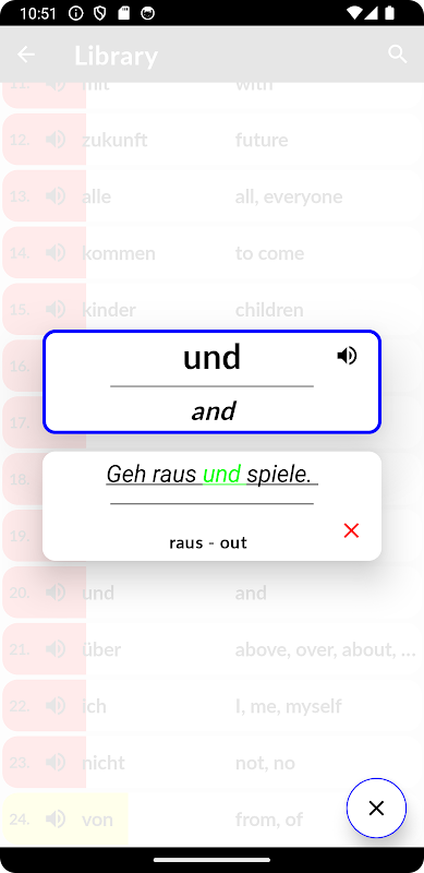 Wenn Benutzer eine Reihe von Fragen erfolgreich beantworten, schalten sie neue Wörter für das weitere Training frei. Diese progressive Lernmethode stellt sicher, dass die Benutzer ständig herausgefordert und engagiert werden. Je schneller Benutzer Fragen richtig beantworten, desto schneller schalten sie neue Wörter frei, was das Lernerlebnis dynamisch und lohnend macht. Alle freigeschalteten Wörter können im Bibliotheksbereich überprüft werden, sodass Benutzer ihr Wissen jederzeit erneut aufrufen und vertiefen können.