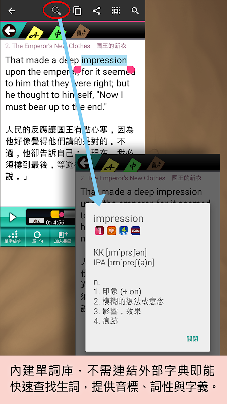 5. 查字義功能,內建單詞資料庫,針對查詢的單詞提供音標、詞性、字義,協助快速理解文章內容。