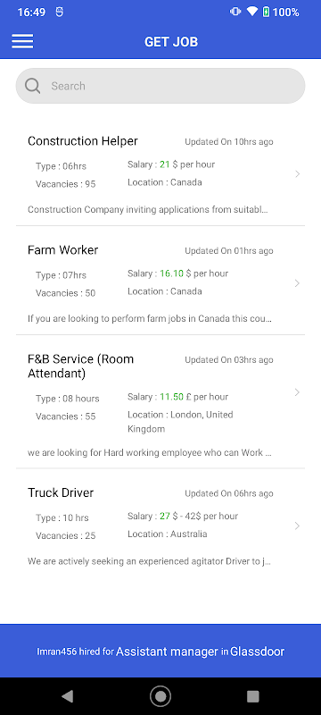 "Get Job" ist die ultimative Jobsuche-App für Arbeitssuchende, sie hilft Ihnen, Ihre nächste Chance mit Leichtigkeit zu finden. Mit seiner benutzerfreundlichen Oberfläche können Sie nach Schlüsselwörtern, Standort und Branche nach Jobs suchen. Erstellen Sie ein Profil, laden Sie Ihren Lebenslauf hoch und bewerben Sie sich direkt über die App. Bleiben Sie über die neuesten Stellenangebote auf dem Laufenden und verpassen Sie keine Gelegenheit, Ihre Karriere voranzutreiben. Get Job macht Ihre Jobsuche einfach und unkompliziert. Laden Sie es jetzt herunter und finden Sie Ihren Traumjob!