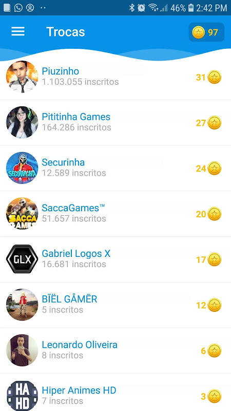 Cada moeda tem o valor de 1 inscrito, se você se inscrever em um canal de uma pessoa você ganha 1 moeda e se alguém se inscrever no seu você perde uma moeda