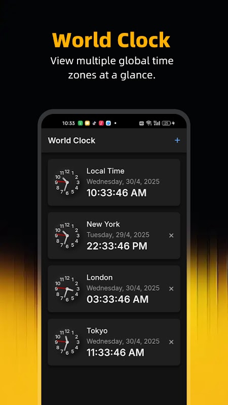 Intelligente Weltzeituhr- und Zeitzonen-App mit Stoppuhr, Reiseplaner und Dunkelmodus.