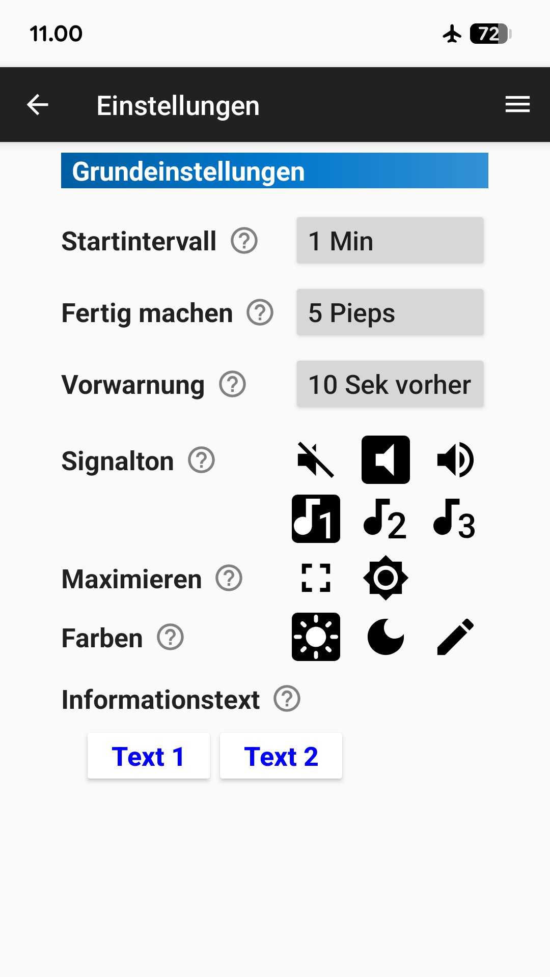 - Vom Benutzer wählbare Farben für normale Zeit, Zeit für Fertig machen, und Startzeit (wie bei einer Ampel).