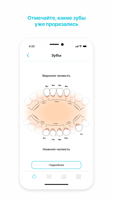 Visuelle, personalisierte Diagramme zum Wachstum und Gewicht Ihres Kindes, eine Zahnungstabelle, Wortlisten, motorische Entwicklungsphasen, ein Tagebuch für Arztbesuche und Impfungen – alles kostenlos in der App!
