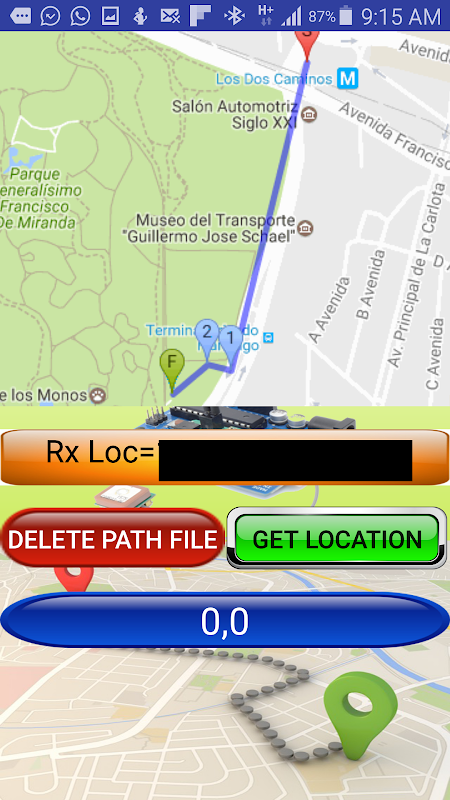 Das Remote-GPS-System kann in einem Roboter, Fahrzeug, Flugzeug usw. In dem Maß, angeordnet sein, dass das Remote-System überträgt die Koordinaten auf unser Gerät die Route in der geographischen Karte gezogen wird, die mit verschiedenen Markern gemacht wird. Die Startmarkierung ist mit dem Buchstaben „S“ und der endgültigen Markierung mit dem Buchstaben „F“ gekennzeichnet. Zwischen diesen Markierungen werden verschiedenen Marker mit Zahlen identifiziert erzeugen. Alle Satellitenkoordinaten durch die externen GPS übertragen werden, in einer Datei im internen SD unseres Geräts automatisch gespeichert. Die Datei, die alle Satelliten enthält Koordinaten empfangen wird „ruta.txt“ genannt. Diese Datei kann verwendet werden, wie in einem GPX oder KML-Datei auf Seite umgewandelt werden;
