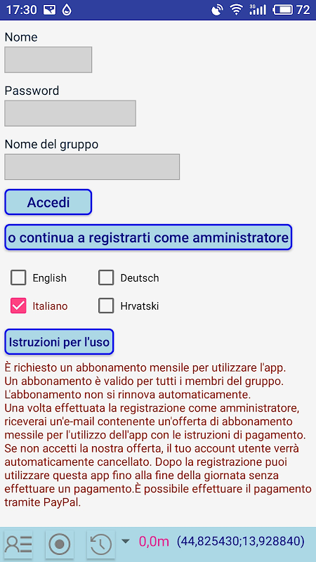 Für die Nutzung der App ist ein monatliches Abonnement erforderlich. Ein Abonnement gilt für alle Gruppenmitglieder. Der Administrator zahlt den Betrag des Abonnements basierend auf dem Angebot, das ihm von der App nach der Registrierung des Benutzerkontos automatisch gesendet wird. Das Abonnement wird nicht automatisch verlängert.