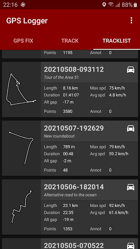 Sie können alle Ihre Fahrten aufzeichnen, sie mit jedem installierten externen Viewer direkt aus der In-App-Trackliste anzeigen und sie auf viele Arten im KML-, GPX- und TXT-Format teilen.