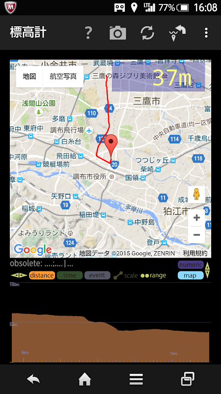 現地点の地面高度(標高)を移動に伴い刻々と表示します。