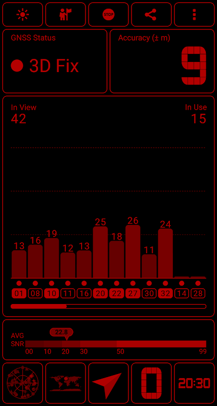 Mit dieser App können Sie den GPS-Empfang in Ihrer Nähe überprüfen und die AGPS-Daten für schnellere Fixzeiten aktualisieren, während Sie andere GPS- und Sensordaten anzeigen können. Die App fungiert als zentrale Anlaufstelle für die Anzeige: Ihre Höhe, genaue UTC plus Ortszeit, Ihr Kompasskurs, die Mondphase und die Tageslichtstunden. Es unterstützt GPS-, GLONASS-, GALILEO-, SBAS-, BEIDOU- und QZSS-Satelliten. Die App verfügt über verschiedene Farbschemata, die je nach Geschmack geändert werden können, einschließlich eines Nachtmodus. Die Farbschemata können auch verwendet werden, um andere Instrumente neben der App abzugleichen.