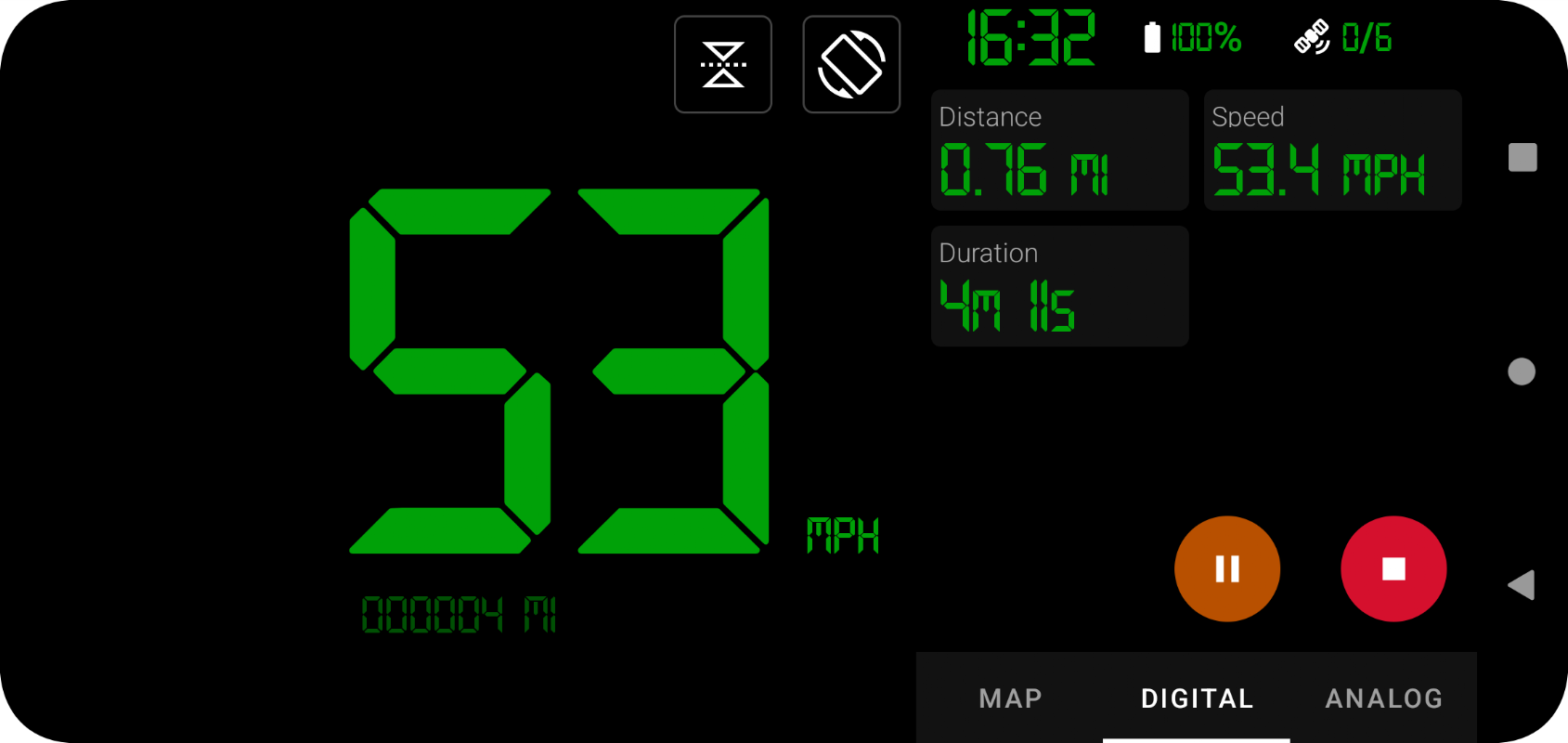 Verfolgen Sie mühelos Ihre Autofahrten, Läufe, Spaziergänge oder Radtouren mit dem integrierten GPS Ihres Telefons. Wechseln Sie zwischen Karte, digitalem oder analogem Tacho.