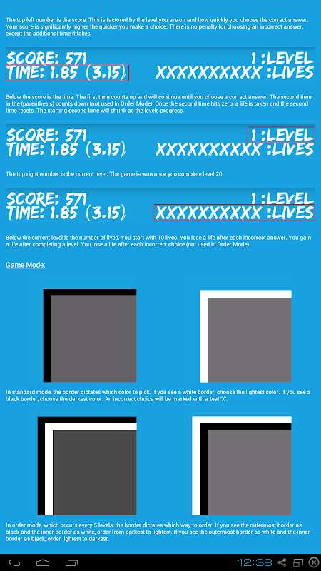 Continue to choose and as you play you will be able to detect finer distinctions along a shade spectrum. Watch your vision progress. We hope the visual complexities of your surroundings begin to show.
