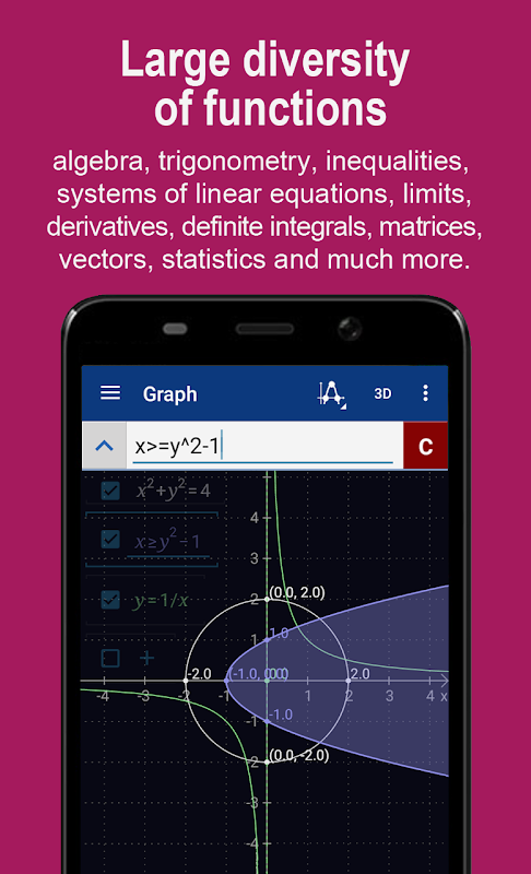 Wenn Sie ein App für einen hervorragend und reibungslos funktionierenden Grafikrechner suchen, so haben Sie es jetzt gefunden! Der Grafikrechner von Mathlab ist als wissenschaftlicher Rechner nicht nur ein unverzichtbares Instrument für Schule und Universität, sondern auch für Wissenschaftler, Ingenieure und alle, die beruflich oder privat komplexe Berechnungen durchführen müssen und dazu einen Rechner brauchen, der mehr kann als ein einfacher Taschenrechner. Das Programm wurde nämlich entwickelt, um sperrige, teure Grafikrechner durch einen solchen im Taschenformat zu ersetzen. Es arbeitet auf nahezu jedem Android-Handy oder Tablet-PC.