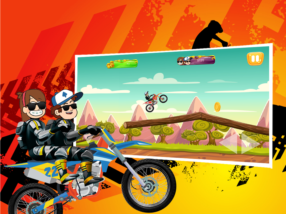 the famous hero of gravity fall Dipper and his twin sister Mabel, smart cartoon caracters,they were sent by their parents to gravity fall in Oregon,and they take adventures with motorcycle and unlock levels and motorcycles,
