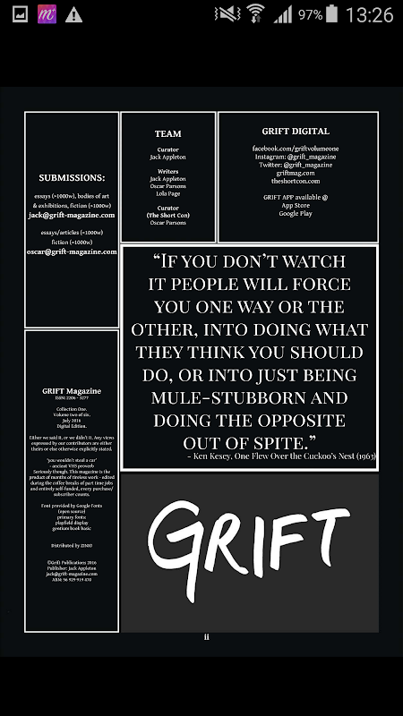 Discovering a new generation of creators. GRIFT offers a fresh look at the defining new voices of art, literature and thought, investigating just what it means to be a creator in the 21st Century. GRIFT delivers quarterly releases alongside weekly content (via GRIFT's The Short Con), delving into the construction of the identity of modern makers and thinkers.