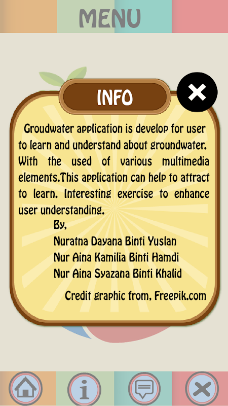 This project is to design an application for Department of Civil Engineering students about “Groundwater E-Learning Application”. This project is to create an application that provide a notes for JKA’s students to be as a reference besides a book. This application provide information about groundwater resources and the formula of calculation of the flow water. These applications are making it a whole lot easier for engineer’s students to gain knowledge about groundwater.