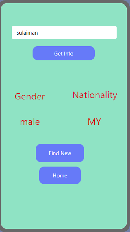 Diese App wird anhand Ihres Vornamens Ihr Geschlecht und Ihre Nationalität vorhersagen. Geben Sie Ihren Vornamen in die Eingabetaste ein und klicken Sie auf „Informationen“. Daraufhin werden Ihr Geschlecht und Ihre Nationalität vorhergesagt.