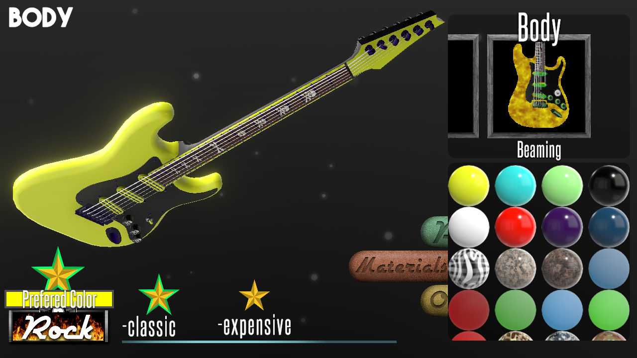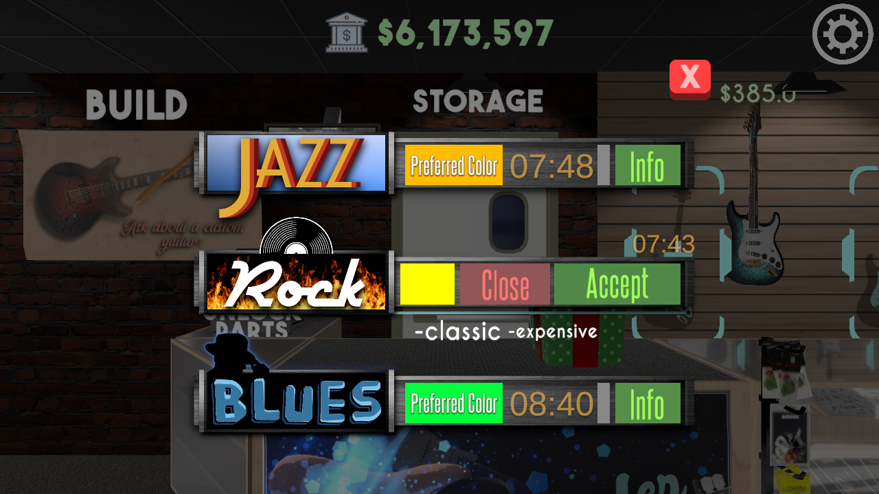 Unlock tons of custom parts to make unique guitars. Millions of possible guitars, 500+ unlockable parts and materials for guitars. Build requested guitars, build and sell you own guitars, and manage your shop to earn money and unlock new parts.