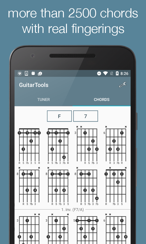Chords library with more than 2500 chords including e.g. 9th, 11th, 6th, m(add9), m7(#5)...