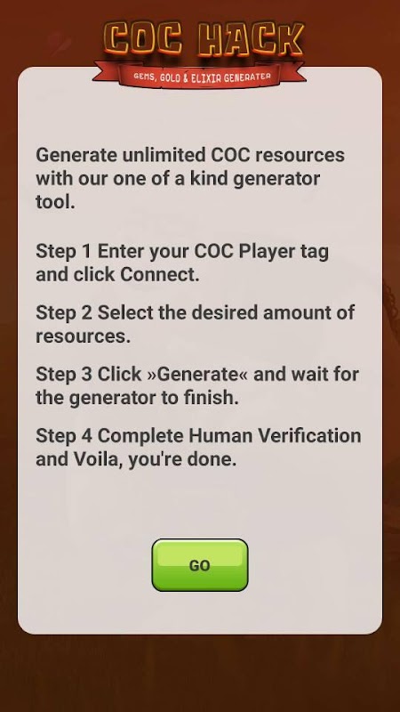 This app is not a real hack for Clash of Clans. Its only a prank and it does not give gems or resources to your coc account.