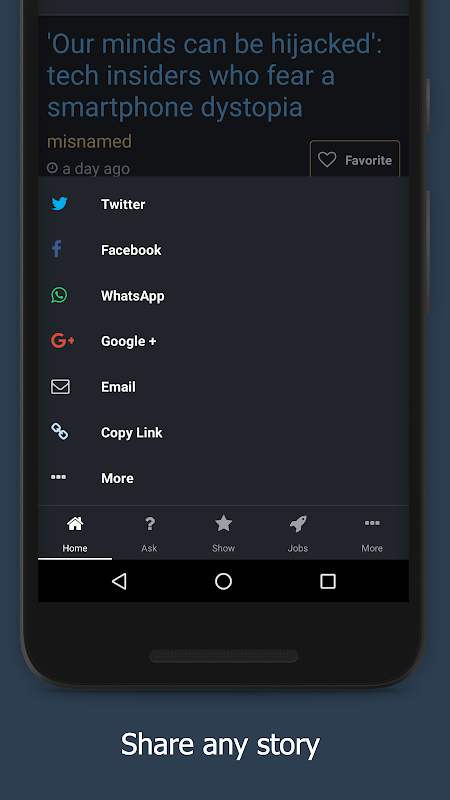 Read your favorite Hacker News (https://news.ycombinator.com/) stories in this dark themed app.