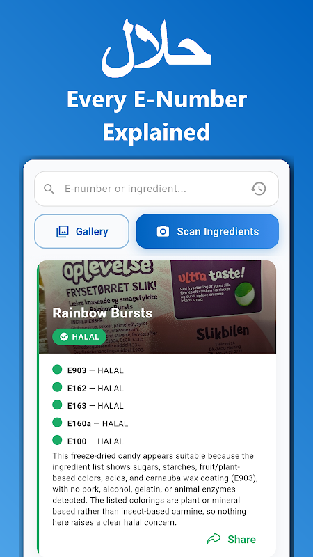Durchsuche über 500 E-Nummern und Tausende von Zutaten mit verifiziertem Halal-Status. Unsere Datenbank wird regelmäßig aktualisiert basierend auf den neuesten islamischen Urteilen und Forschungen von anerkannten Gelehrten und Zertifizierungsstellen weltweit.