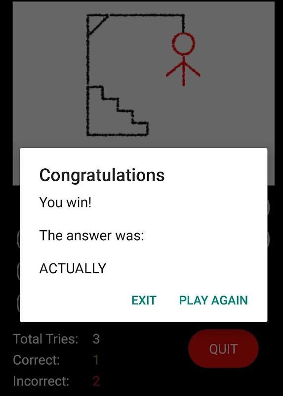 You get seven chances to guess the word or the man will be hanged! When you make a mistake, one part of the hanging man will appear on screen. Your score will be shown below as you progress. You may quit any time by pressing the quit button on screen.