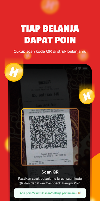 Genießen Sie ein wirtschaftlicheres Leben mit Hangry Points Cashback für jede Bestellung, die Sie mit der Hangry App tätigen. Keine Sorge ... diejenigen unter Ihnen, die gerne über Grabfood, Gofood oder Shopeefood bestellen, können die Funktionen auch nutzen, indem sie unseren Markenkaufbeleg scannen. Mit den Punkten können Sie mehr bezahlen oder gegen verschiedene attraktive Prämien eintauschen!