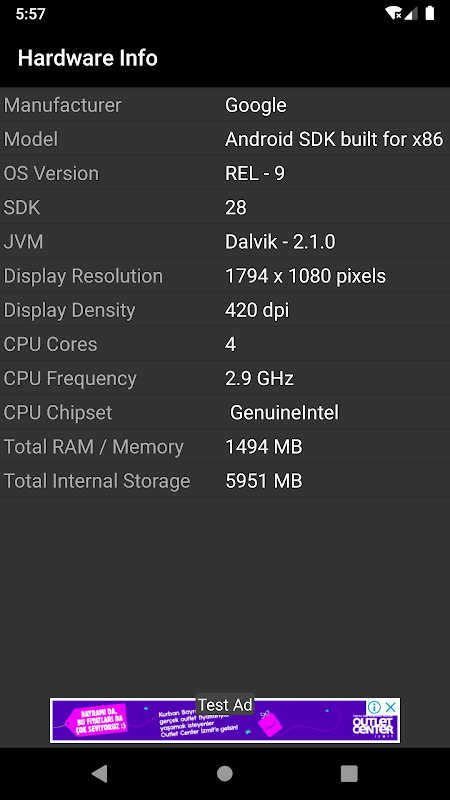 Zeigen Sie die allgemeinen Hardwarespezifikationen Ihres Geräts an. Es werden die wichtigsten Spezifikationen Ihrer mobilen Hardware wie RAM, CPU, Kerne, Hersteller, Modell, Betriebssystemversion, SDK und mehr aufgeführt.