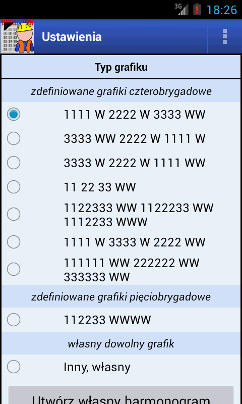 Definieren Sie in den Programmeinstellungen die Art des Arbeitssystems und die Starttage des Zyklus für einzelne Brigaden (der erste Tag der ersten Schicht für A-, B-, C-, D- und E-Brigaden (für eine Fünf-Brigade)). Basierend auf diesen Daten berechnet das Programm den Arbeitsplan.