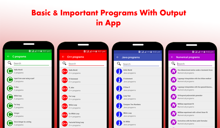 • Chapter wise complete C, C++, Java, Numerical in C programming, Data structures in C programming.