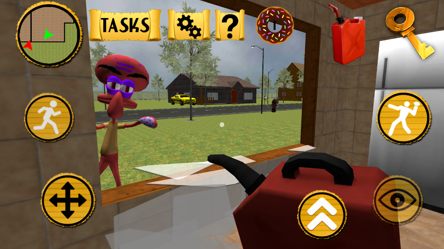 Search and use of useful items. Find a gas can, pipe wrench, keys and the like - all this will be very useful to you in the Squid neighbor's house! In Hello Squid. Sponge Neighbor of Bob 3D the neighbor himself, apparently, is a pretty dangerous octopus. Stay unnoticed and uncover a terrible Squid's secret!