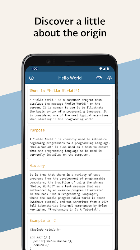 Anwendung, die den Ursprung des berühmten Computerprogramms "Hello World!" zeigt, fügt außerdem einige Minispiele hinzu, wie zum Beispiel: "Finde die Paare", "BugSnake" und "Memory".