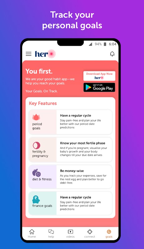 Ziele: Verfolgen Sie Ihre Lebensziele. Sparen Sie Geld, machen Sie sich fit, verfolgen Sie Ihre Periode, finden Sie Ihr fruchtbares Fenster und holen Sie sich einen Schwangerschaftsführer. All dies soll Ihnen helfen, Ihre persönlichen und beruflichen Ziele zu überwachen.