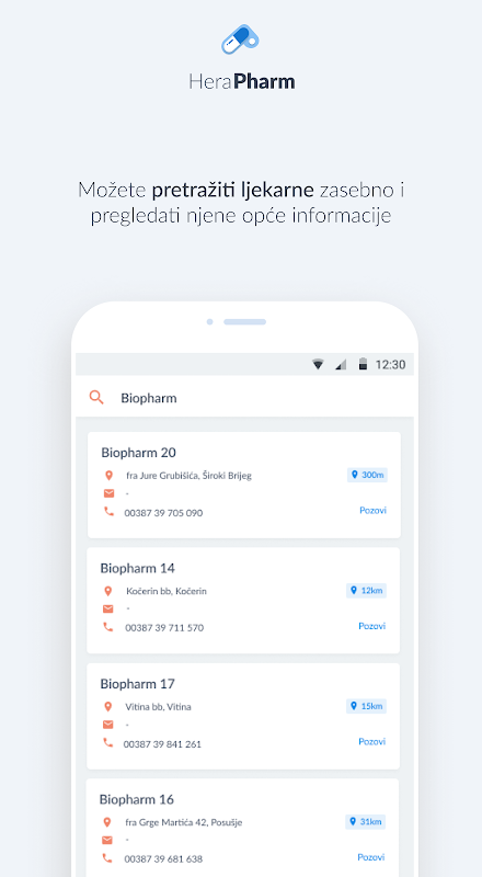 Koristeći aplikaciju HeraPharm, u svakom trenutku su vam na vašem mobitelu dostupne informacije o ljekarnama i njihovoj ponudi. Tu su i opće informacije o ljekarni, radno vrijeme, dežurstvo, kontakt i lokacija.