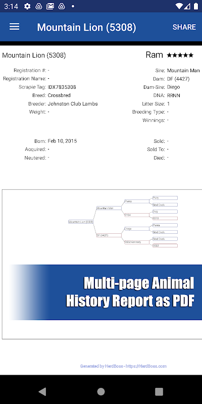 - Generiert einen einfachen einseitigen oder zweiseitigen Bericht, der alle Informationen über jedes Tier in Ihrer Herde enthält, was es den Käufern leicht macht, alles über das Tier zu erzählen
