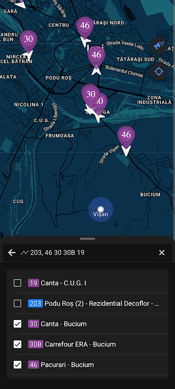 Click pe o statie ca arata liniile de legatura, click pe o linie va putea sa o afiseze vehiculele pe harta (va ajuta la decizia de transbordare)