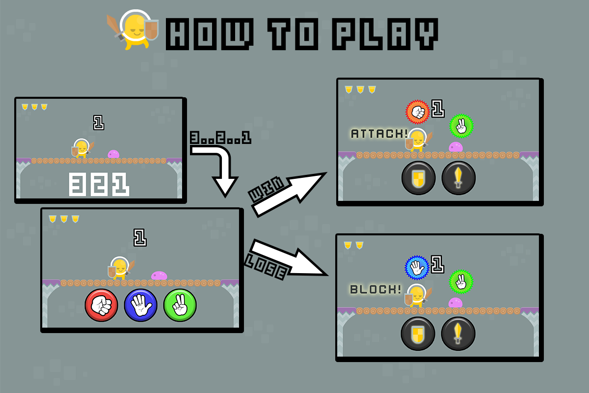 Schwingen mit dem Schwert und Block mit Eurem Schild. Held 321 Freies Spiel wird ein altes Spiel-Stil "Rock, Paper, Scissors" von Ihnen bekannt zu ändern. Versuchen Sie, Monster mit Rock, Paper, Scissors Spiel-Stil zu schlagen und die Nummer eins in der Welt !!