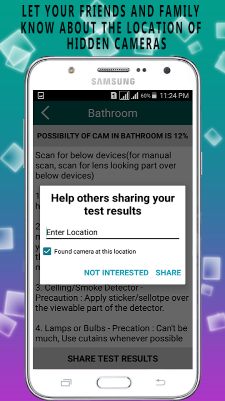 This spy camera detector app has one more tool which is detect infrared lights.Just open the infrared detector and scan for white light that appear on screen but not visible by naked eye. Such white light indicate infrared light.It could be infrared camera. Your normal cam can also detect it but what we have is inbuilt feature with luminescence effect.