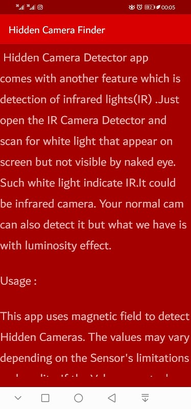We have developed Hidden Camera Finder - This is an app that can solve the privacy problems. Our Hidden Camera Detector will help you to detect Hidden Cameras, Spy Cameras and Electronic Device nearby. You can use this hidden camera detector to detect any such hidden electronic devices.