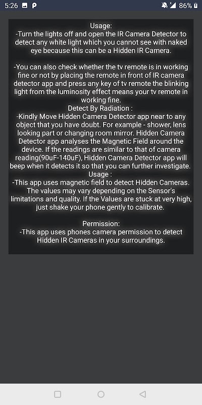 IR Hidden Camera Detector ist eine sehr hilfreiche App für alle, die Privatsphäre wünschen. Wenn Sie sich in einem Raum befinden, in dem Sie der Meinung sind, dass Ihre Privatsphäre beeinträchtigt werden kann, ist unsere App die beste Lösung für Ihr Problem. Dieser Hidden-Kamera-Detektor erkennt versteckte Kameras, da diese Infrarotstrahlung abstrahlen. Dieses Infrarotlicht kann nicht mit bloßem Auge gesehen werden.