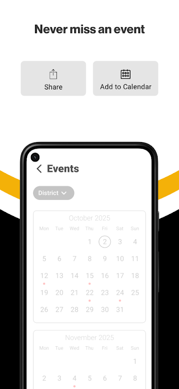Der Veranstaltungsbereich zeigt eine Liste der Veranstaltungen im gesamten Bezirk. Benutzer können ihrem Kalender ein Ereignis hinzufügen und das Ereignis mit einem Fingertipp mit Freunden und Familie teilen.