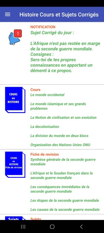 Cours d'Histoire et sujets corrigés est une application contenant plusieurs sujets corrigés en histoire