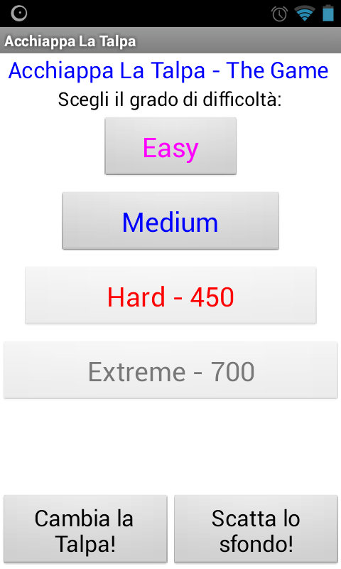 I livelli di difficoltà si basano sul tempo che hai a disposizione per prendere la talpa nel suo buco: easy 2 sec, medium 1 sec, hard 0,7 sec, extreme 0,5 sec.