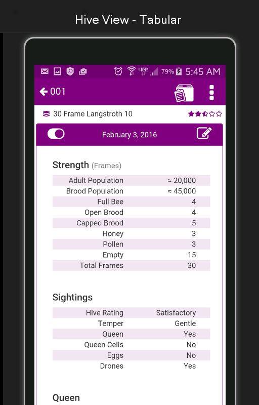 With HiveTool Mobile's Express Setup feature you'll build up your apiary's (bee yard) beehives in seconds, not minutes or hours. Simply create an apiary, specify how many beehives there are and stage beehive configurations in short order. You'll be logging inspections in no time.