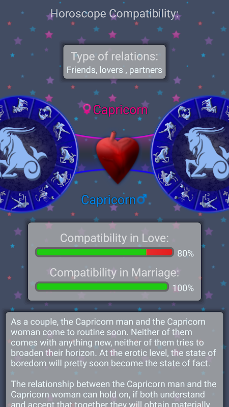 💘Sie können auch die Kompatibilität Ihres Sternzeichens mit einem anderen überprüfen und eine Annäherung an einen Partner finden.