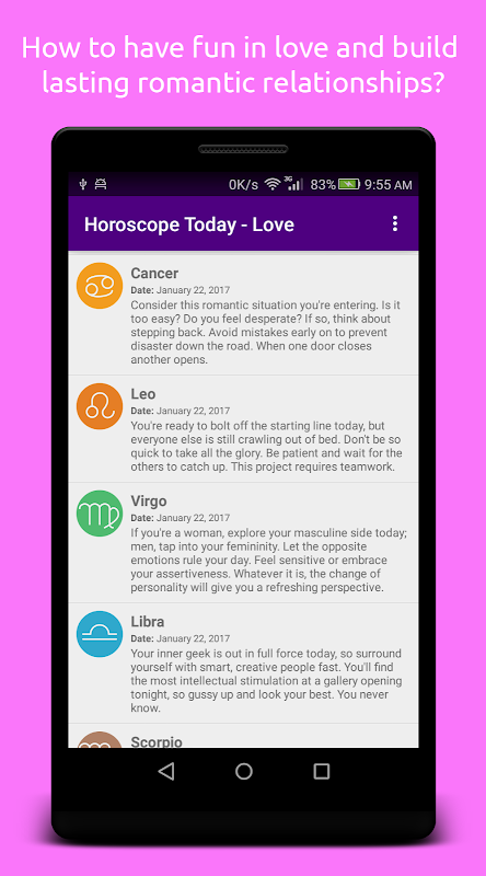Mit der kostenlosen App Horoscope Today können Sie Ihr persönliches Tageshoroskop lesen. Sie können das Horoskop in folgenden Kategorien lesen: Allgemein, Liebe, Flirt, Karriere und Finanzen.