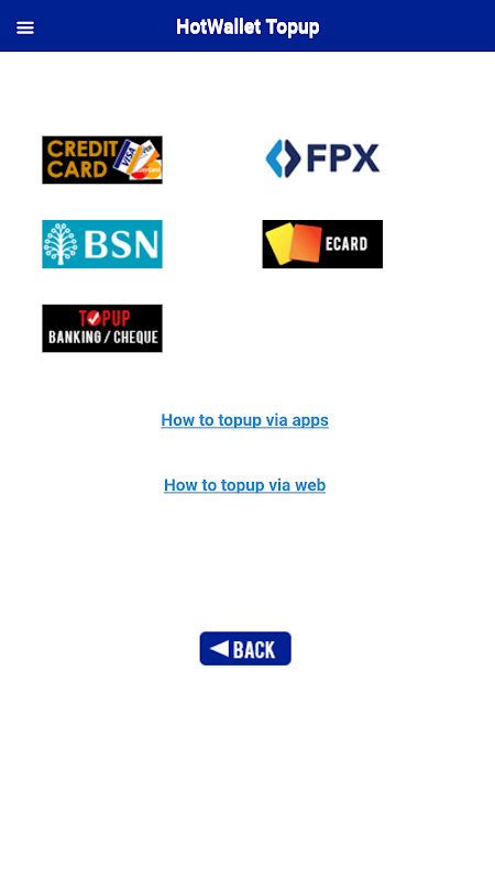 Wallet, Wallet Payment to other Merchants for any purchases, similar Wallet Top Up (via Cash/Cheque/Visa/Master Card/BSN Pin/Jompay-2394), Wallet Transfer for