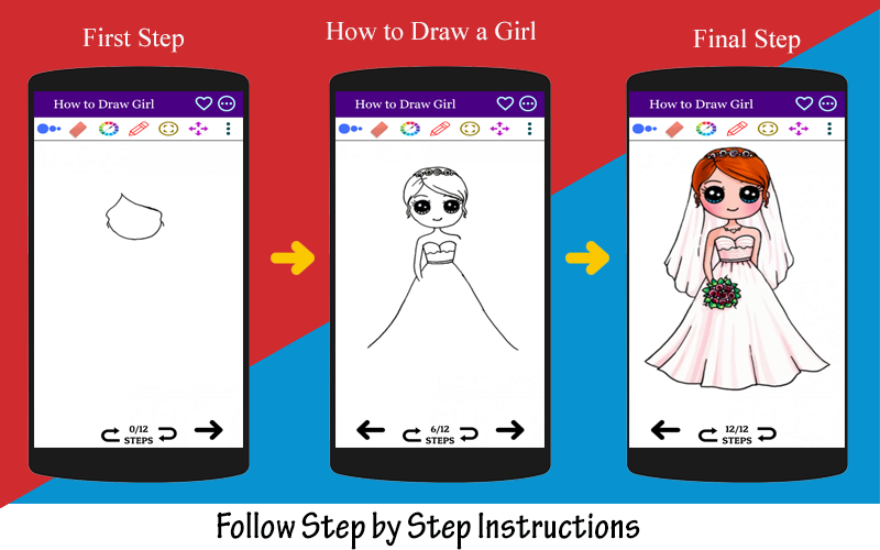 Also, worauf wartest Du? Laden Sie unsere einfachen Tutorials zum Zeichnen von niedlichen Mädchen herunter und installieren Sie sie und lernen Sie dann kostenlos, wie Sie ein Mädchen direkt auf Ihrem Smartphone richtig zeichnen. Die schönste und süßeste Frau, die Sie zeichnen möchten, wartet bereits auf Sie. Halten Sie Papier und Bleistifte bereit und lernen Sie Schritt für Schritt, wie man Frauen zeichnet.