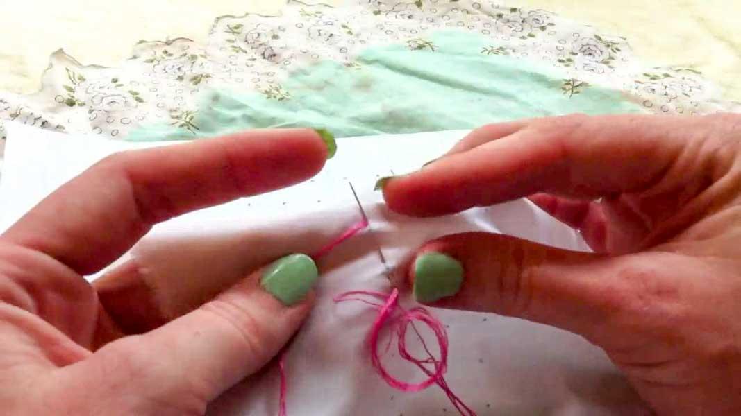 1. Fädeln Sie Ihre Nadel mit Stickerei Zahnseide. Es ist Zeit, diese bunte Stickerei Thread verwenden Sie ausgesucht, um ein gestempeltes Muster zu schaffen. Binden Sie das Ende des Fadens ab.