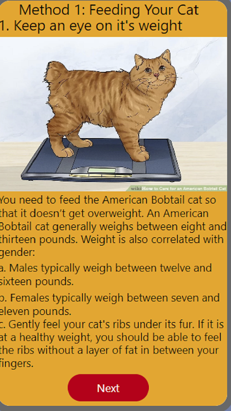 Die App gibt Anweisungen zur Pflege einer American Bobtail Cat. Diese APP hilft Ihnen bei der Pflege einer Katze.